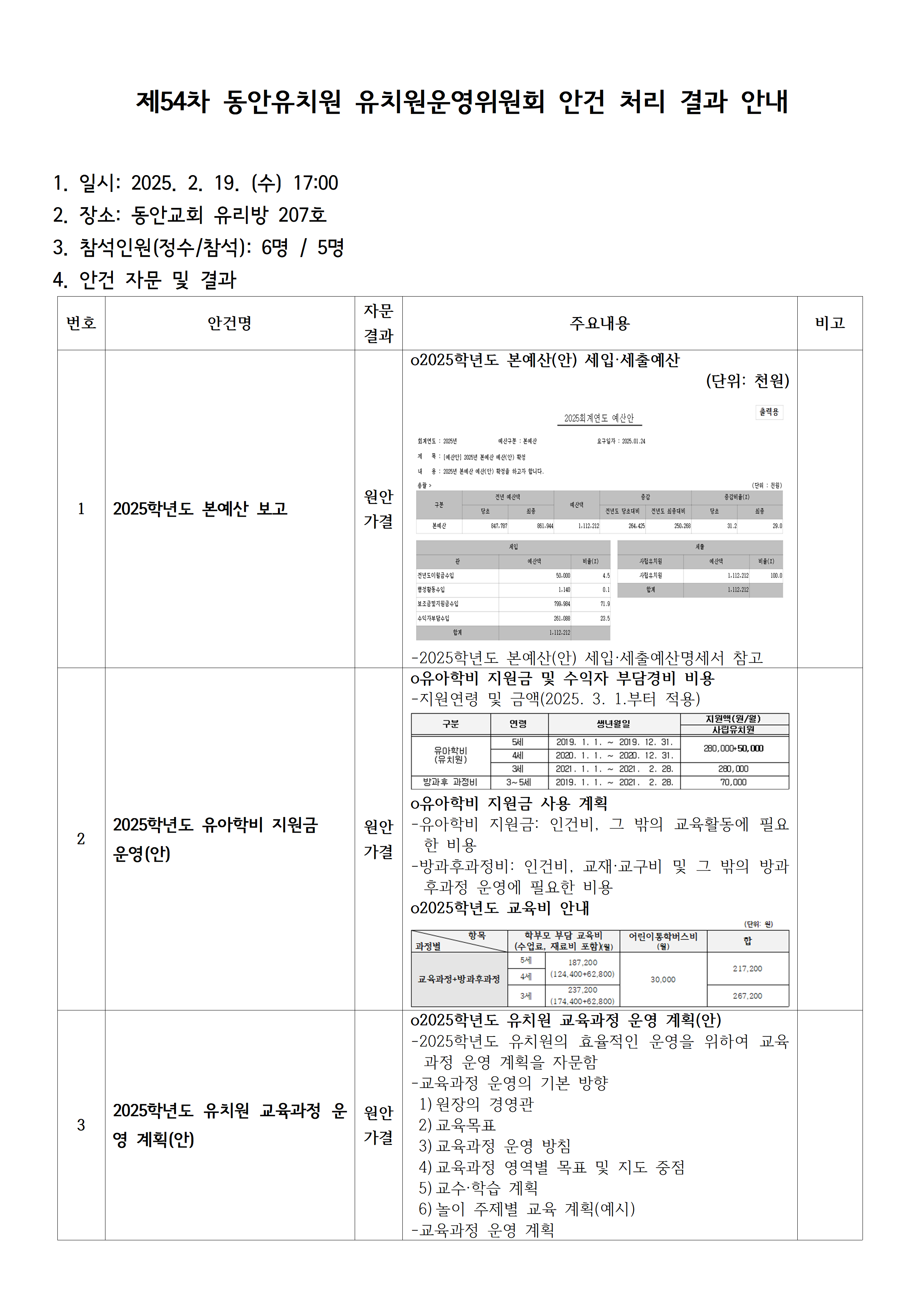 제54차 동안유치원 유치원운영위원회 안건 처리 결과 안내