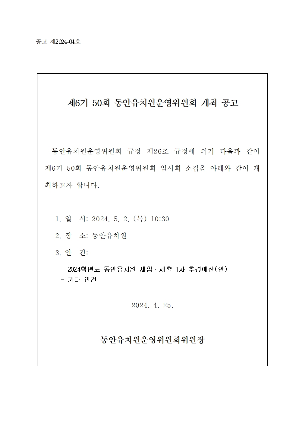 열람 유치원운영위원회 제50회 임시회 소집 공고 880 2024-04-25