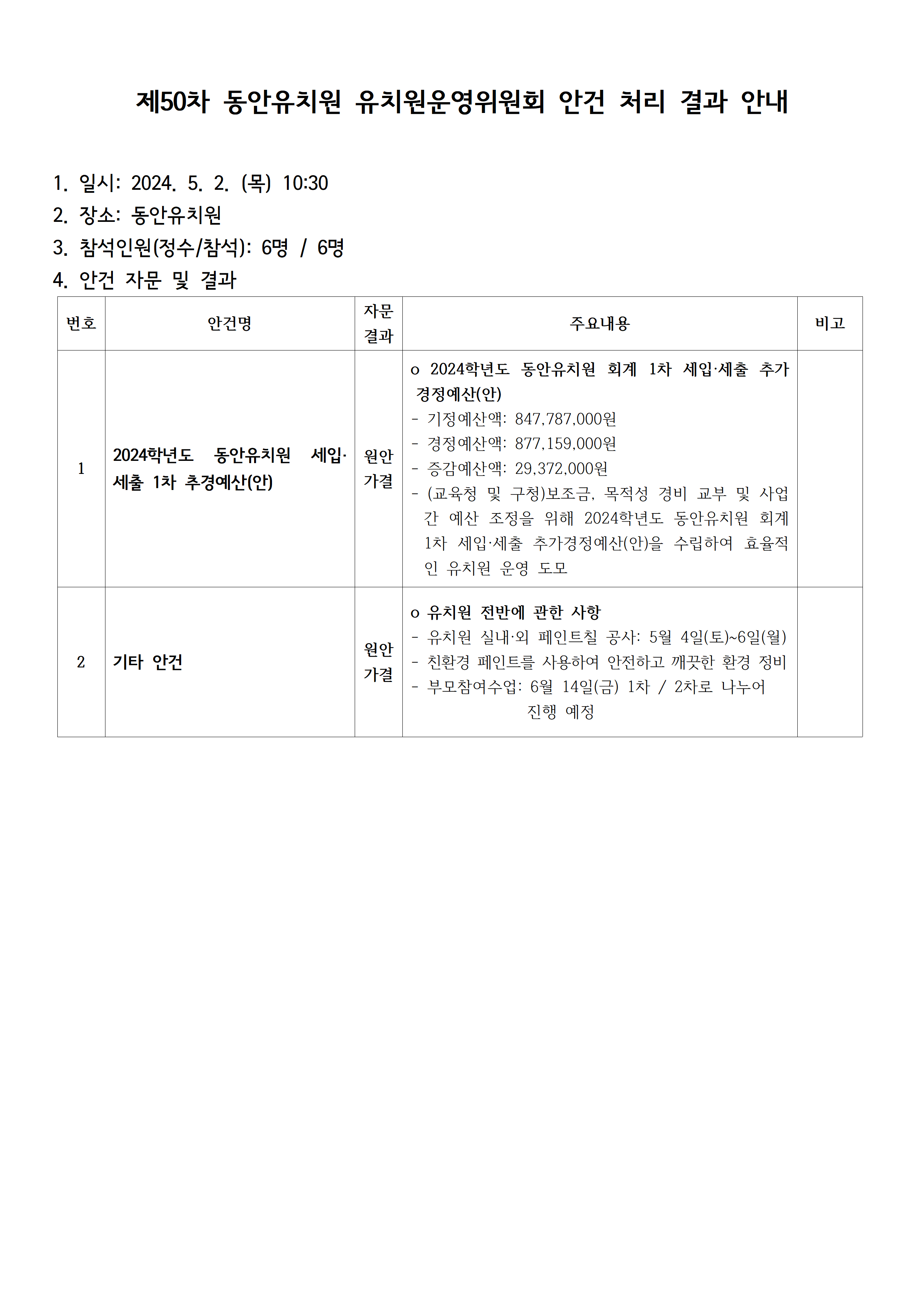 제50차 동안유치원 유치원운영위원회 안건 처리 결과 안내