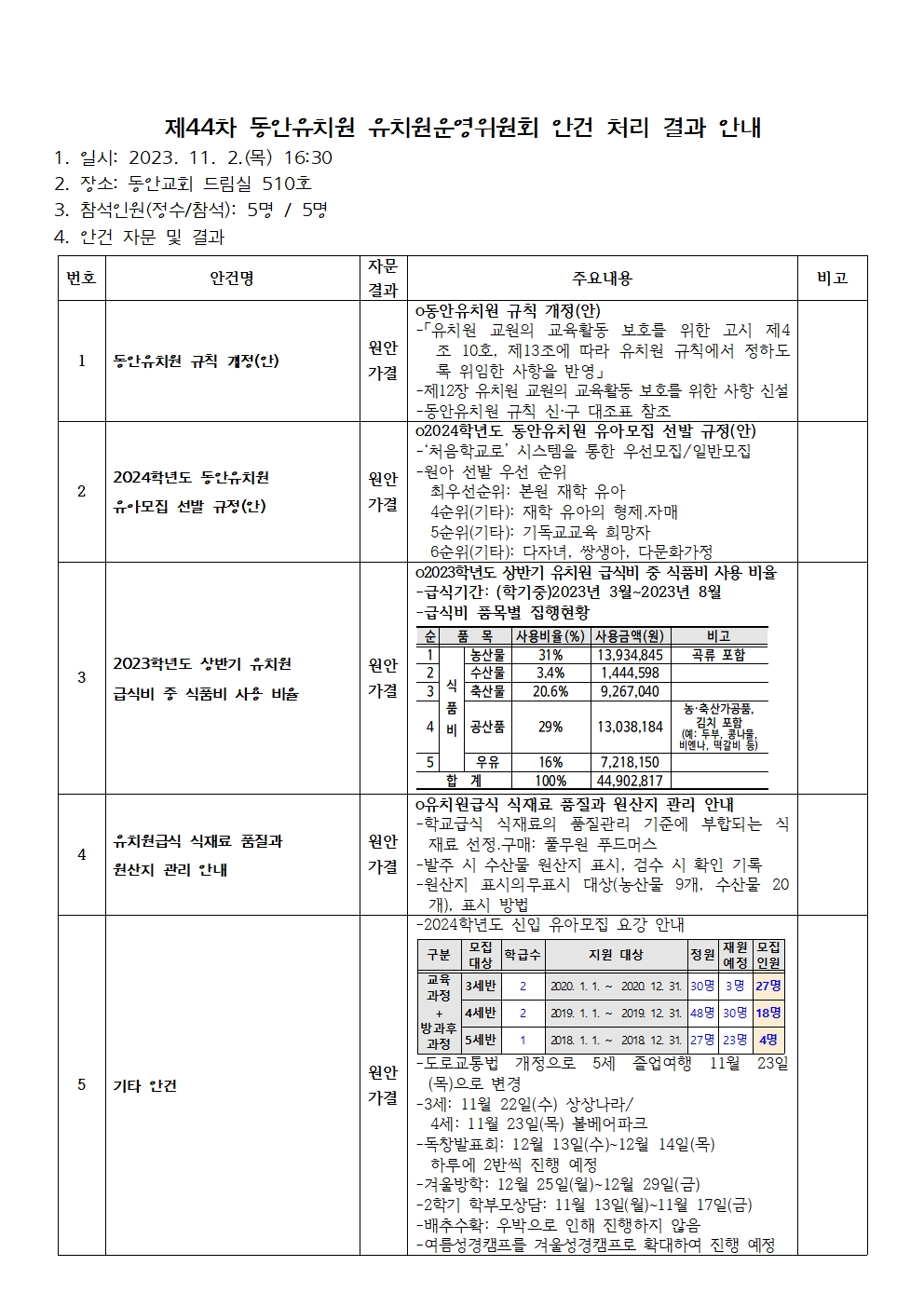 제44차 동안유치원 유치원운영위원회 안건 처리 결과 안내