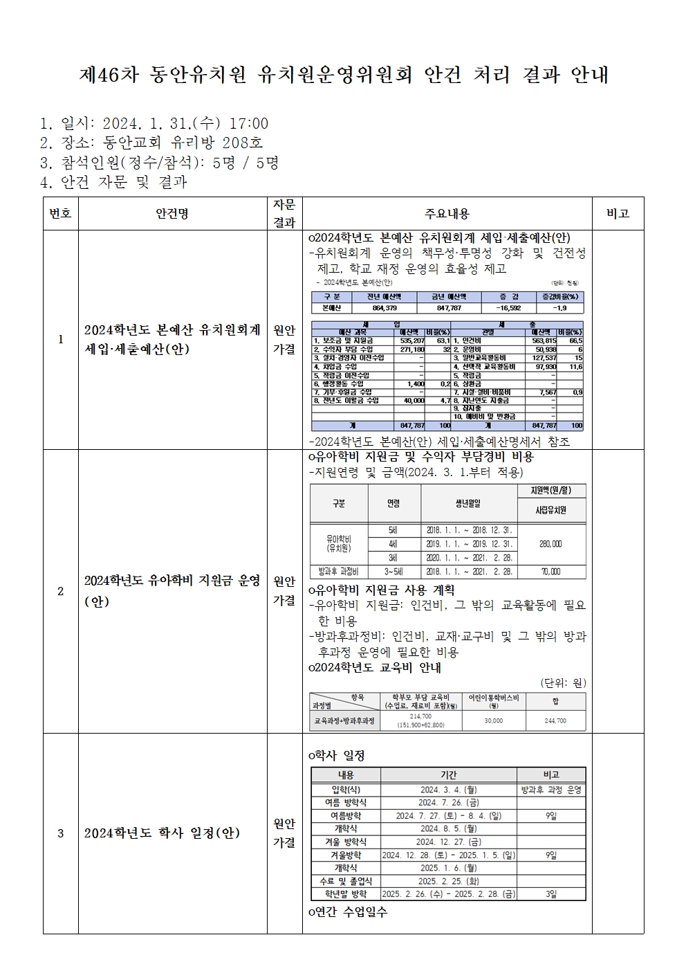 열람 제46차 동안유치원 유치원운영위원회 안건 처리 결과 안내 904 2024-02-02