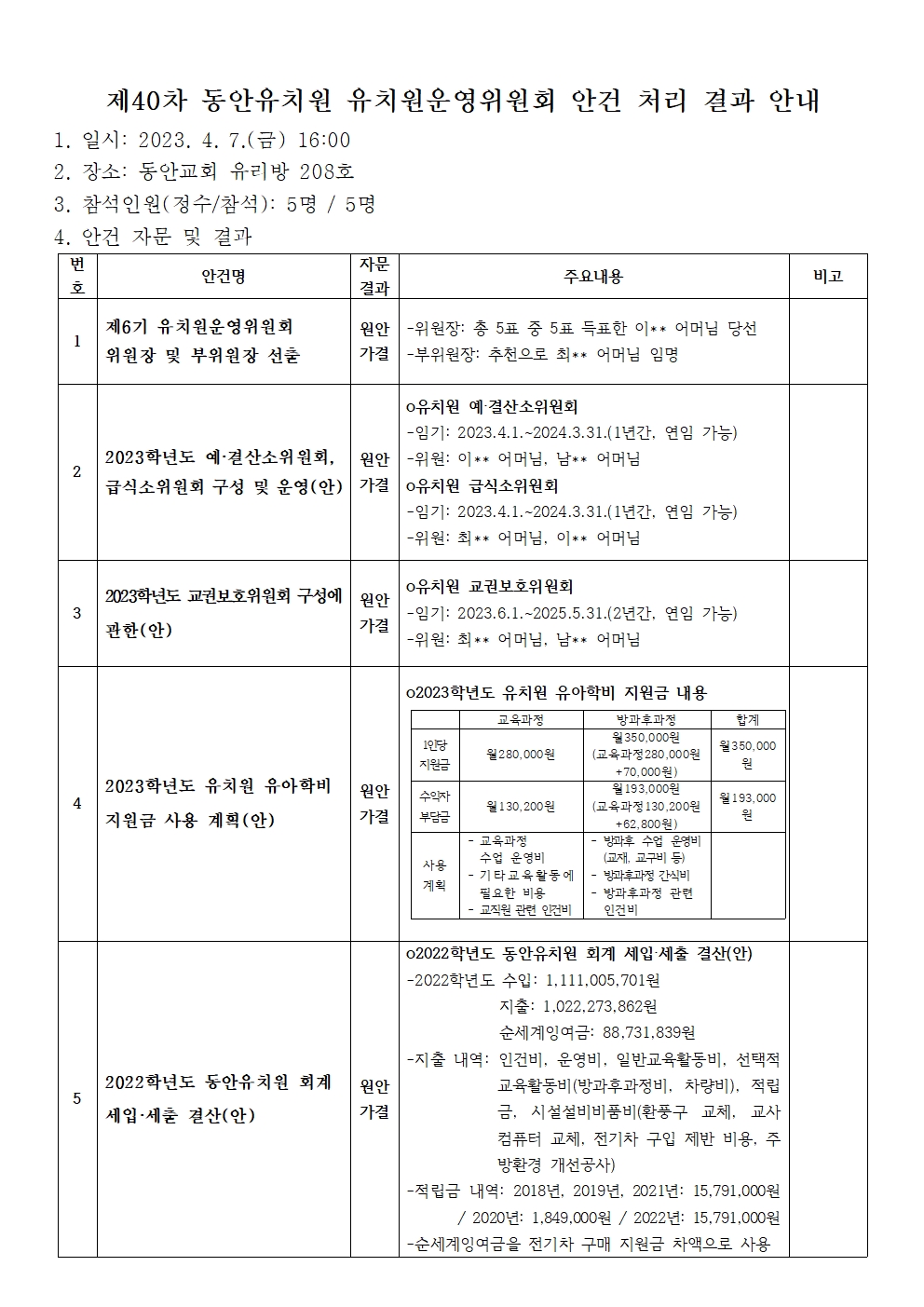 제40차 동안유치원 유치원운영위원회 안건 처리 결과 안내