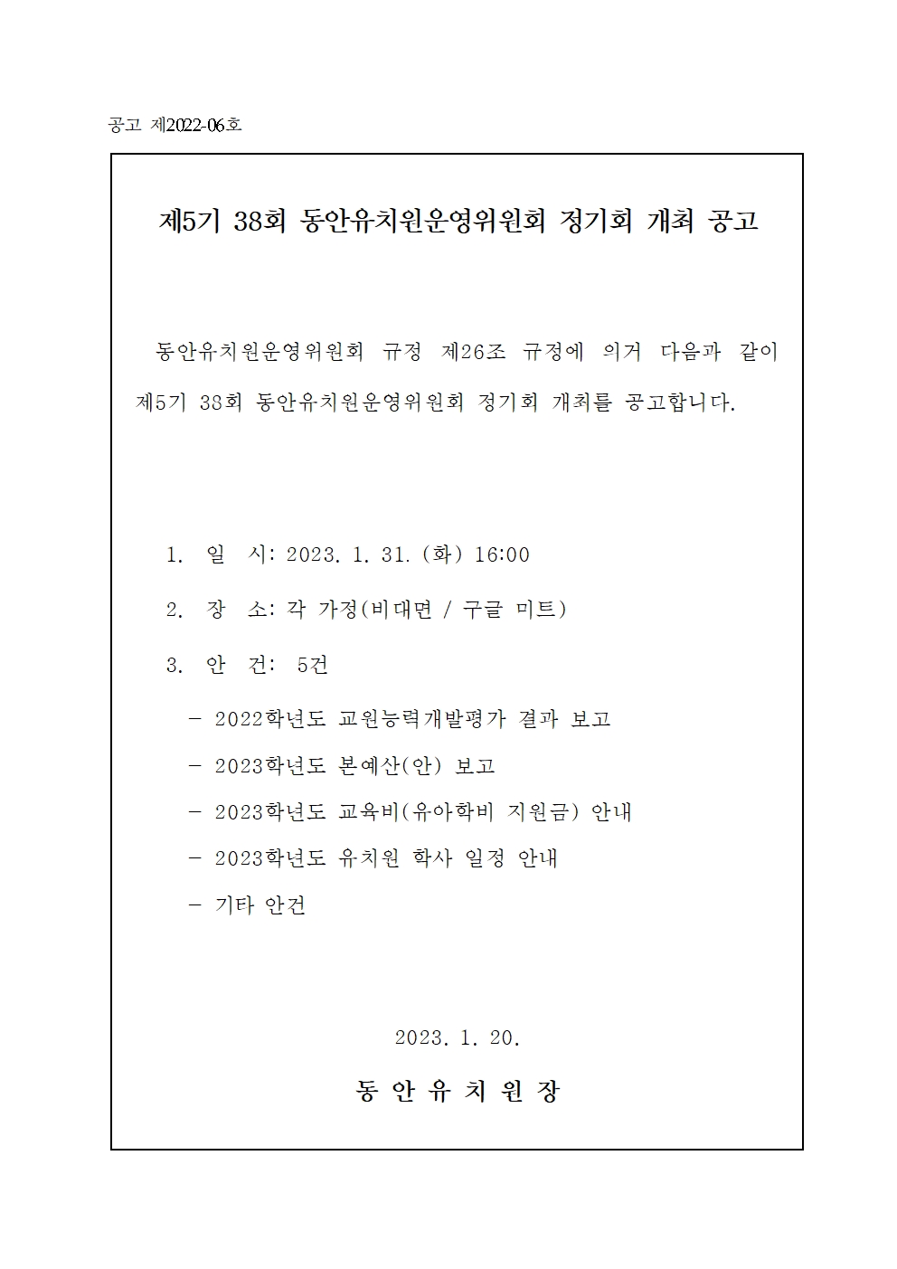 35 제38차 동안유치원 유치원운영위원회 안건 처리 결과 안내 930 2023-02-01