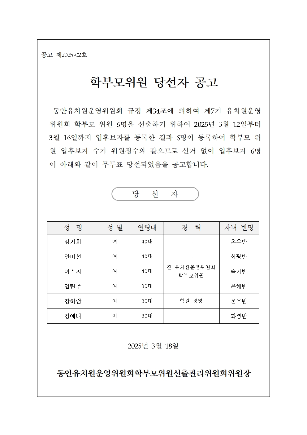 열람 제7기 유치원운영위원회 학부모위원 선거 당선자 확정 및 공고(통지) 975 2025-03-19