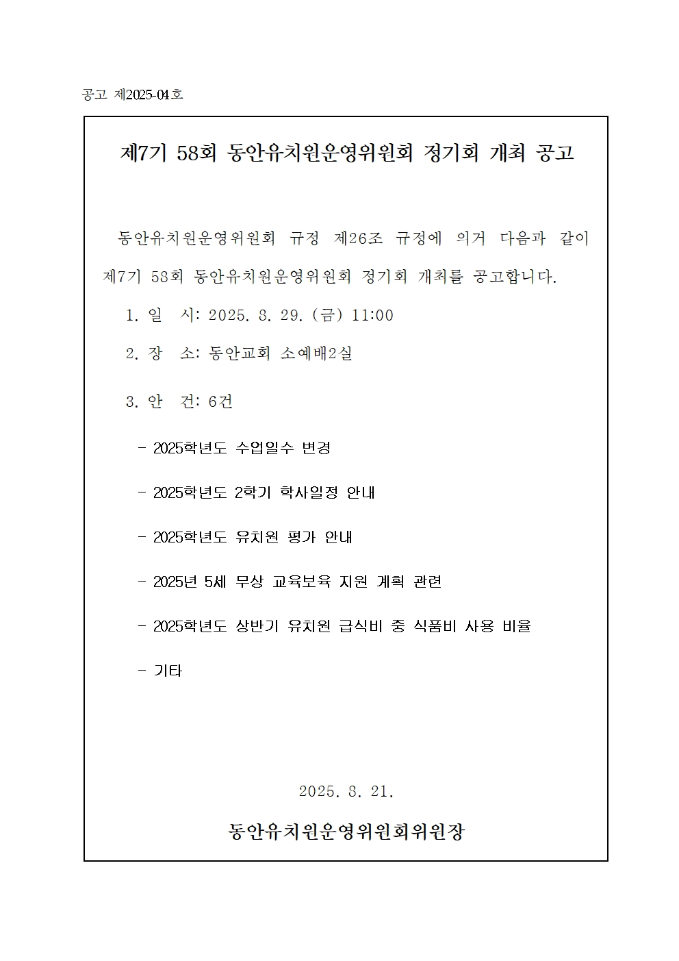 85 제58차 동안유치원 유치원운영위원회 안건 처리 결과 안내 918 2025-09-02