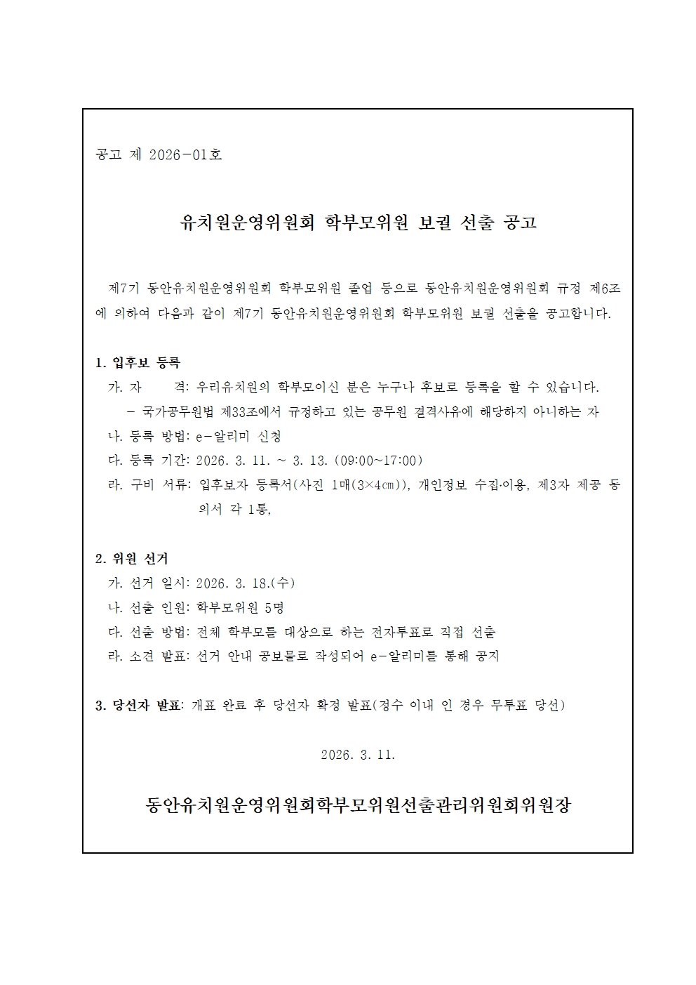 동안유치원운영위원회 학부모위원 보궐 선출 공고